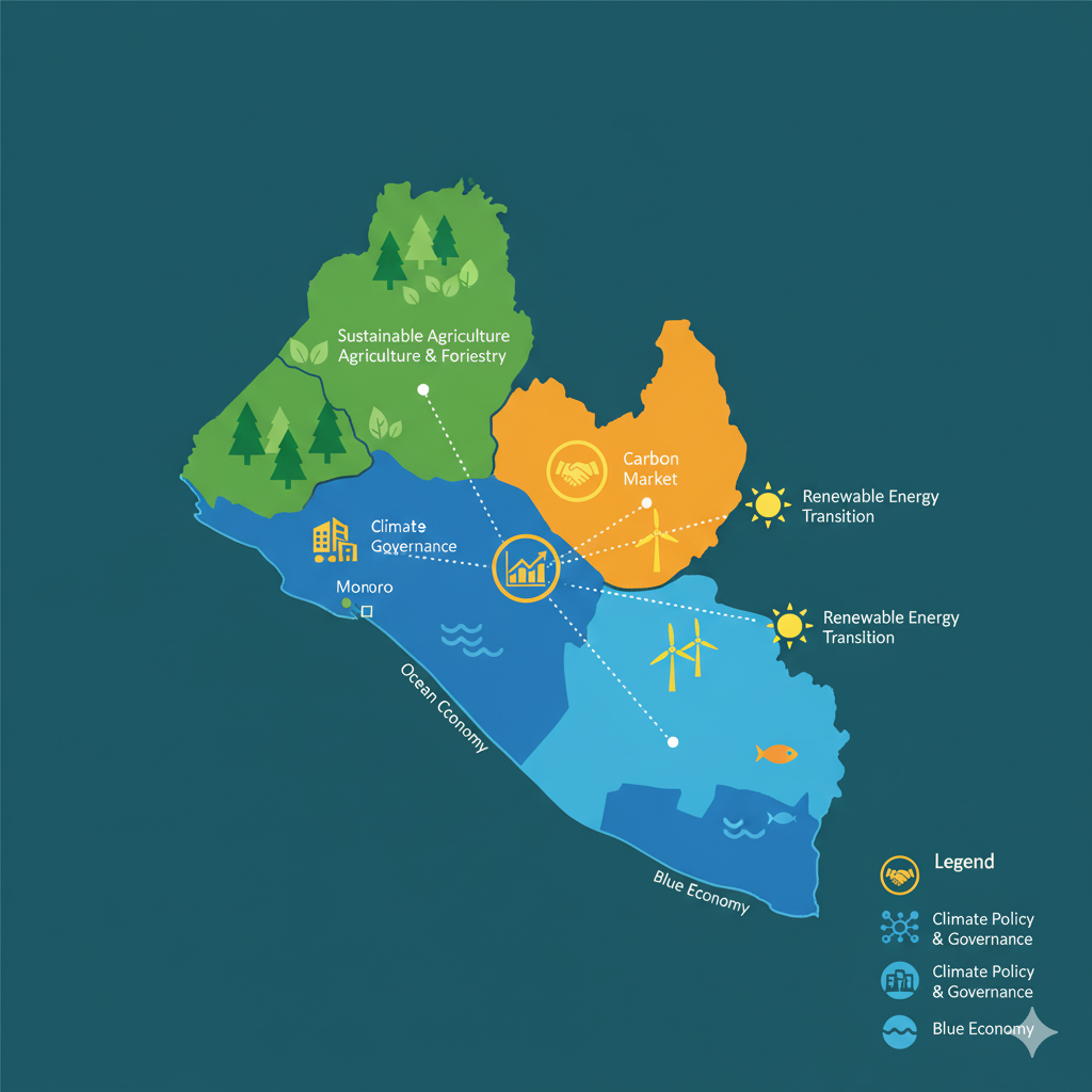 Liberia Carbon Markets Authority addresses climate and development challenges through five core focus areas: Carbon Market, Climate Policy & Governance, Sustainable Agriculture & Forestry, Renewable Energy Transition, and Blue Economy. Together, these pillars form the foundation of Liberia’s climate ambition, powering innovation, inclusivity, and sustainable progress for every community.